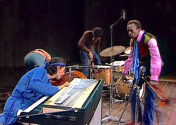 And I'm not the only one who thinks Corea stunk up the gig — as they get ready to leave the stage, Davis glowers at his keyboardist, shooting him a look that could kill small mammals. Corea knows he's in the doghouse and in an awkward move that former Richard Nixon secretary Rosemary Woods would have admired, deliberately avoids his boss' devastating glare. Davis must have been really pissed: Picasso never had to put up with this kind of thing.